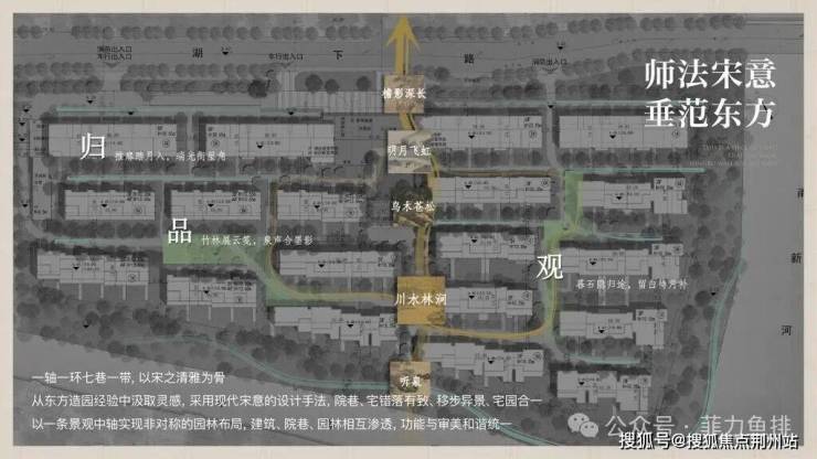 景观架构:独创“一带一轴一环九巷”立体园林——中轴以“壶中天地”造山水叠境,九巷植入四时主题再现宋画《四景山水图》移步异景,滨水带借双河岸打造私属公园;