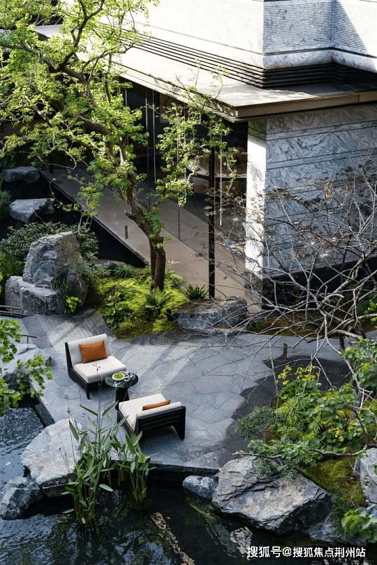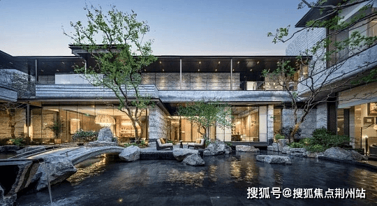 中央水轴长约150米,融入“四水归堂”意境,串联下沉庭院、瀑布泳池等景观节点,复刻《溪山清远图》诗意。
