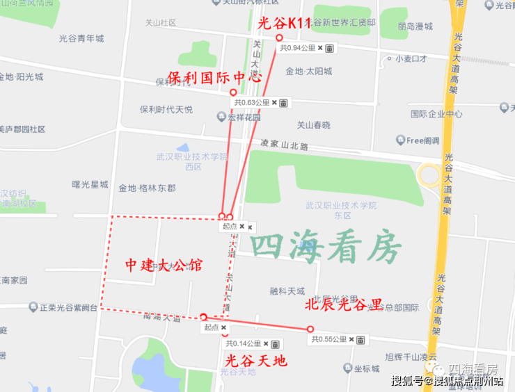 自驾:项目沿关山大道向北可直达华科、光谷广场,街道口等商圈,沿南湖大道上光谷大道高架,有匝道口可以走雄楚大道高架和三环线,快速到光谷中心城。走雄楚大道向西可直达二环线。