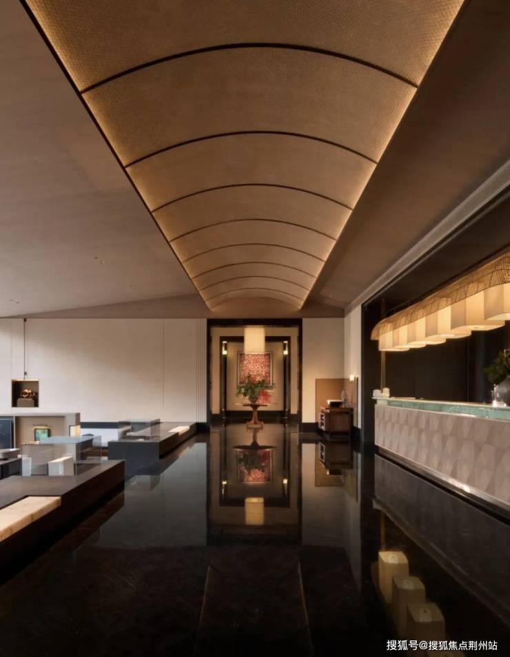 沿艺术楼梯拾级而下,抵达下层空间,各功能盒子以园林式的空间布局分置于自然之中,并用室内游廊串联。游走于廊道之中,有机的空间建构、变化的空间尺度与开阖节奏牵引着人不断探索的意趣,泳池过厅将庭院的瀑布景观引入室内;车马亭廊道的横向长窗将树影投射到墙面,与墙面的水景共同呈现自然的意向。而艺术品成为空间中的“眼睛”,雕塑、画作、装置、摄影、非遗手作等多媒介艺术作品有机置入,诠释空间的叙事性。自然、空间、艺术发生碰撞,共同营造“画中游”的沉浸体验,步履所至,转角之间,皆有景境。