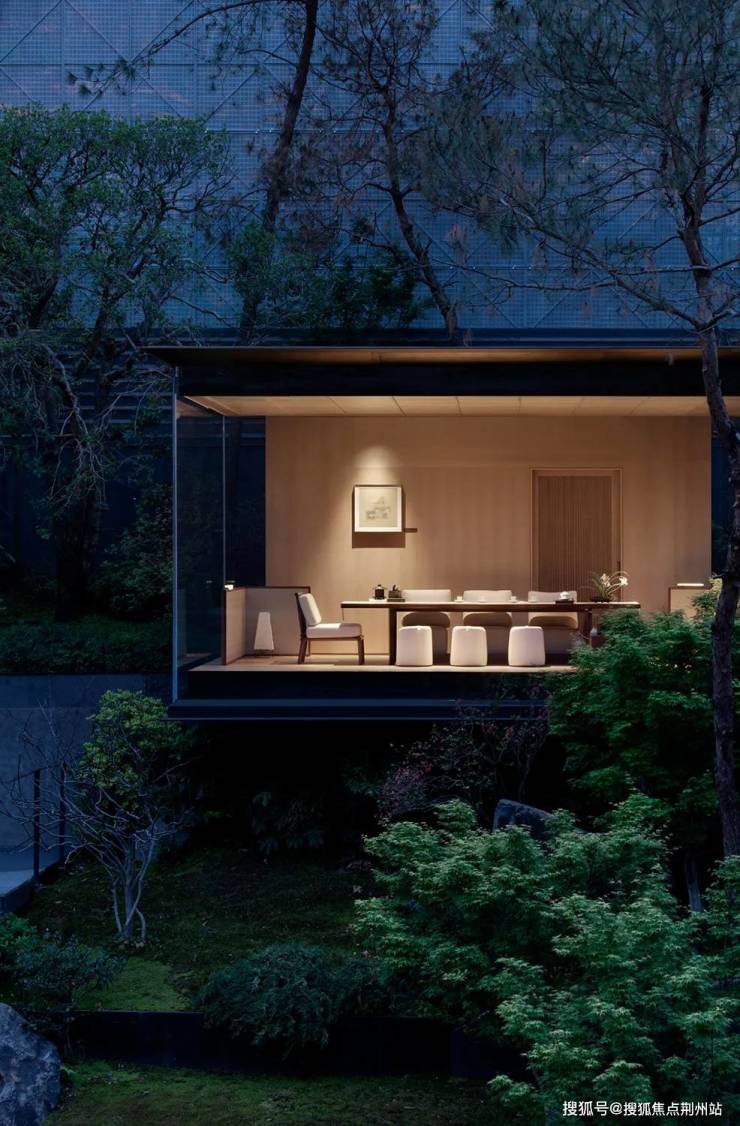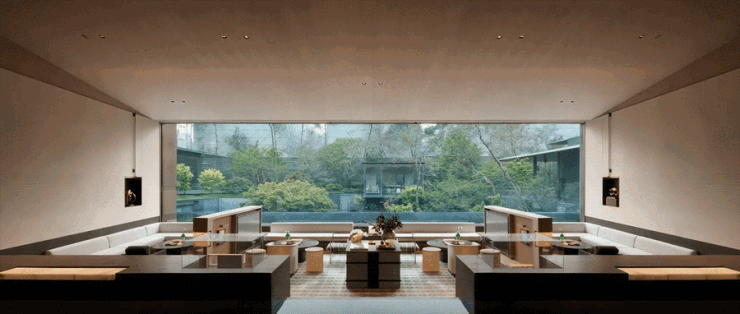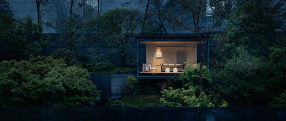 场地占地约2500平方米,建筑环抱庭院,分设上下两层,「生活馆」占据一层主要展开面,14米长、3.2米高的整面玻璃将庭院尽揽无余;「茶亭」则隐逸于自然之中,与生活馆隔空相望,互为景致。「私宴」独自辟出一方天地,在视线上与下沉庭院联动,「健身房」和「活动工坊」分置于庭院南北两侧,利用庭院的高差打造出“漂浮的瑜伽室”和“树梢上的露台”等具有差异性的空间场景。