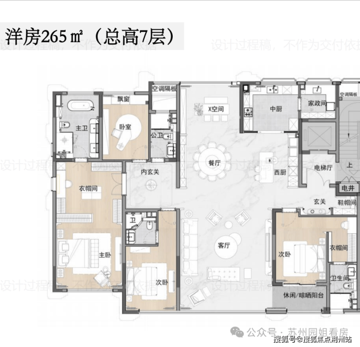 约353㎡,入户双开门,5房6卫,连保姆房都是套房设计;动静分区,其中超级公区带开敞阳台。