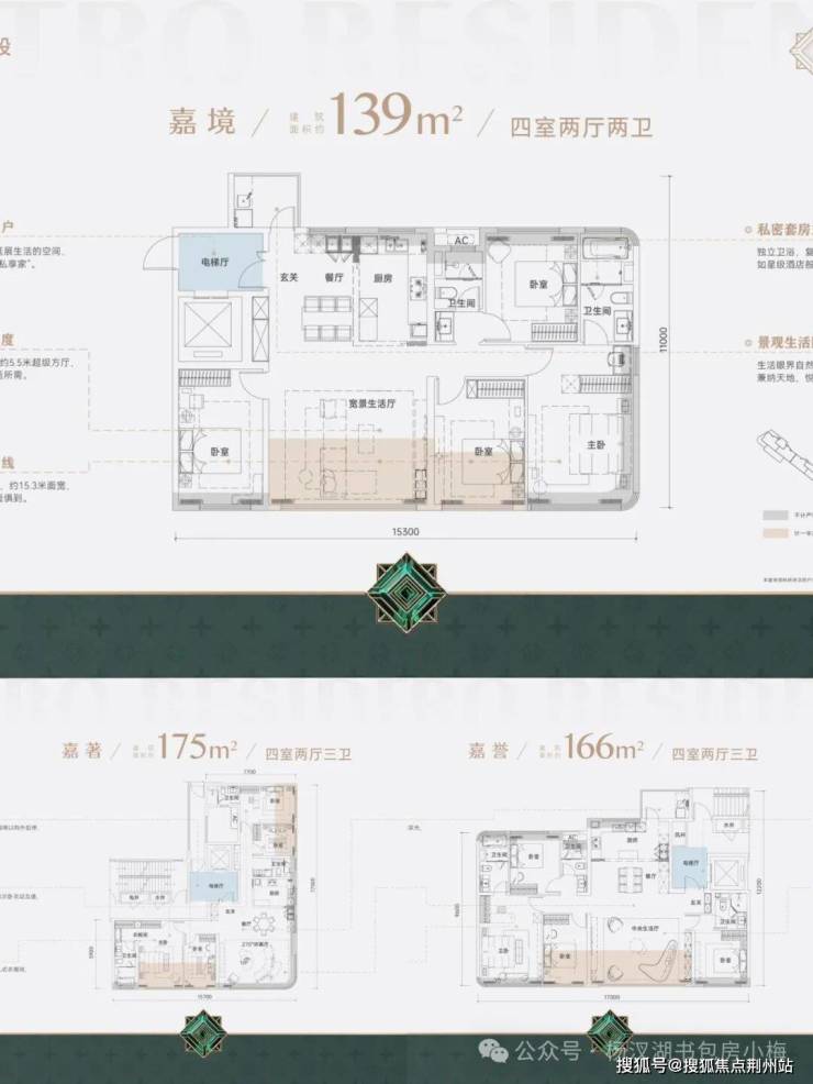 该住宅建筑面积约2.48万方,办公区建筑面积约5.35万方,容积率5.0,建筑密度20.42%,住宅总户数155户,住宅区机动车停车位180个。保利·沙湖嘉瑞打造的也是当前楼市最新的准四代住宅,优化后得房率可达约97-101%,基本可以说是0公摊、住宅1号楼为西南朝向,1号楼住宅首层为架空层,分为两个单元。西边单元为2梯2户,均为166平户型;东边单元为3梯3户,分别为166、175、139平户型。房源全都是专梯入户。