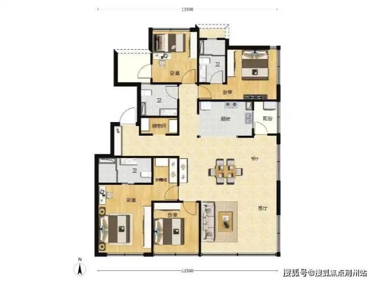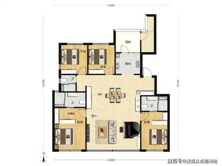 - 135㎡ 四房三卫(改善):横厅+270°采光,双主卧设计,独立衣帽间,空间奢适