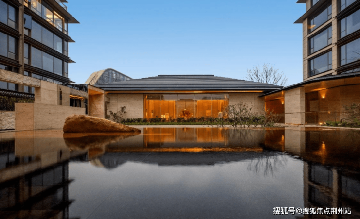转过转角,眼前景象一亮,宽阔的下沉空间尽收眼底。清澈池水倒映着天光云影,与洽谈区无缝相接,室内外的氛围在此交融,营造出无边的和谐与扩展之美。