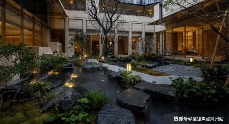 瀑布般的水幕如丝般细腻,将下沉庭院与上层空间巧妙地交织相连,水珠轻舞,幻化成朦胧之洲,营造出一种若有似无的默契。借助顶部镜面材质与四周的全景落地窗,这片角落的空间得以从多个角度融入同一幅画面,打造出既充满趣味又饱含意境的视觉盛宴。