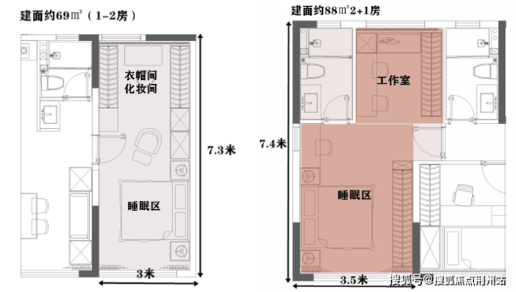 建面约69㎡-88㎡户型,全部使用了S墙设计,通过S型弯曲设计,让墙体内嵌深度更大。