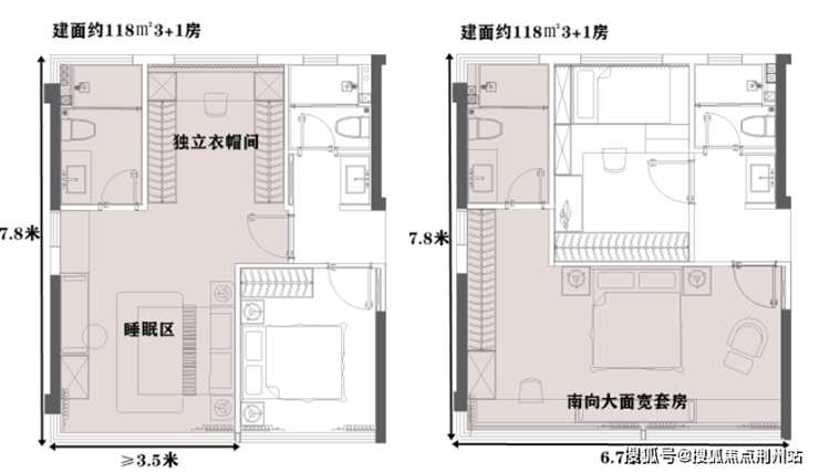建面约118㎡户型,还能实现酒店式主卧套房+南向大面宽套房双重选择。