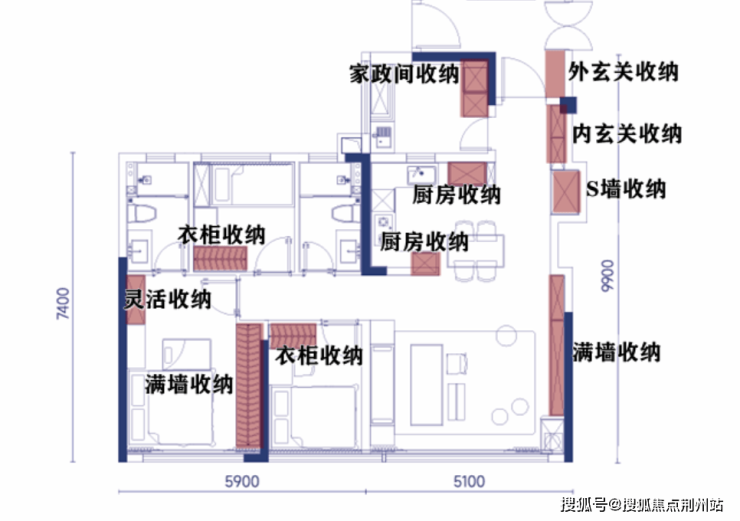 除了预留常规的衣柜、橱柜,空间,它们还通过玄关外置,拥有内外玄关收纳、专属家政间收纳、S墙收纳等庞大收纳系统。