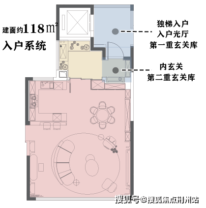 建面约118㎡,出门即独立光厅、专享玄关,为归家首重礼序,独立内玄关则为第二重礼序。