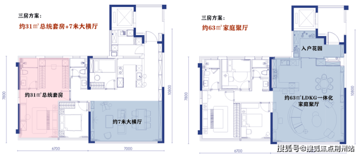 社交满配型三房:约63㎡聚厅,或者是约31㎡总统套房+7米大横厅,随心选。