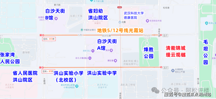地铁5号线/12号线(在建)光霞站:光霞站是白沙洲目前仅有的双地铁换乘枢纽站,清能锦城·缦云观樾步行到该站,只有约300米左右。地铁12号线是武汉首条地铁环线,相信武汉人都知道这条地铁的强大通勤能力。