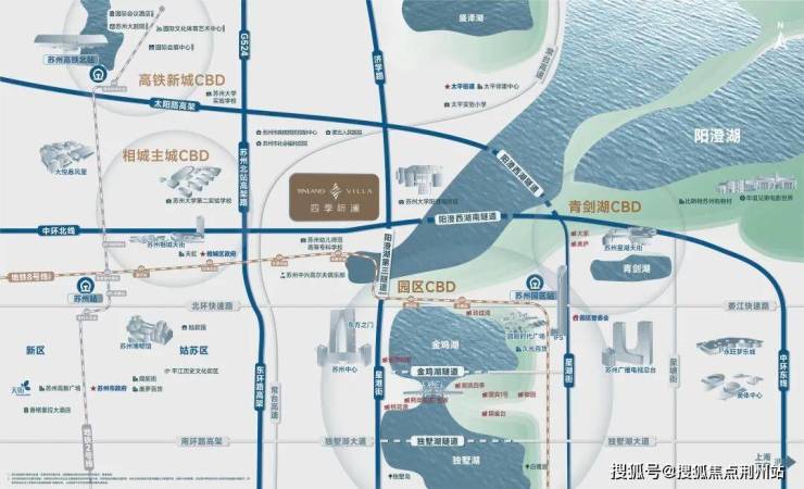 向北为高铁新城、向东为园区青剑湖副中心、向西为相城元和中心、向南为金鸡湖CBD。