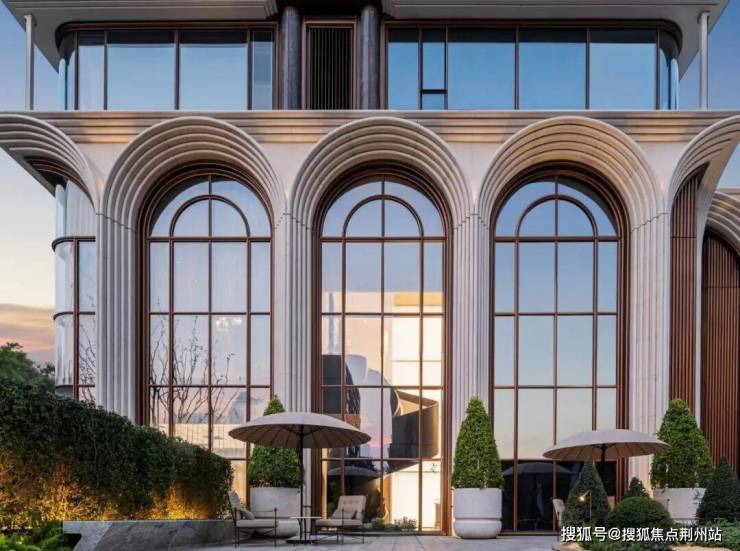 古铜色金属线条化作现代幕墙的横向分割线,270度曲面玻璃的转角,又延展出仿石铝板罗马柱,让古典美学在当代复兴。