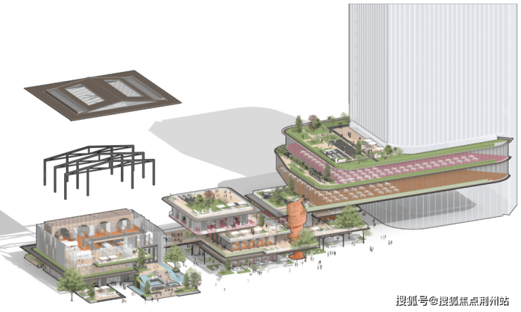 对外的城市客厅:同时,商业街区以开放的姿态融入城市。其设计借鉴了武汉独特的“码头文化”与“船舰”意象,通过层叠如梯田的退台、模仿邮轮甲板的观景平台、以及融入“拱券”语言的空间结构,营造出尺度宜人、充满探索趣味的街区氛围。这里将成为区域新的社交目的地,吸引城市人群前来消费、漫步、观江。