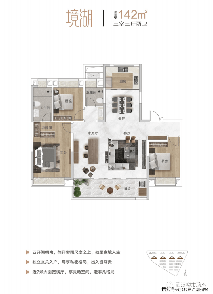 整个户型坚守大面宽理念,利用近7米大面宽横厅+4开间朝南,搭配完整落地窗交付,将空间感放大、放大、再放大。