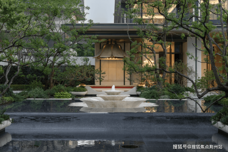 采用预埋式水下灯结合地面射灯的系统化照明方案,对夜间光影进行精确构图,强化水体倒影的戏剧性效果,整体把控并提升场景的意境与品质感。