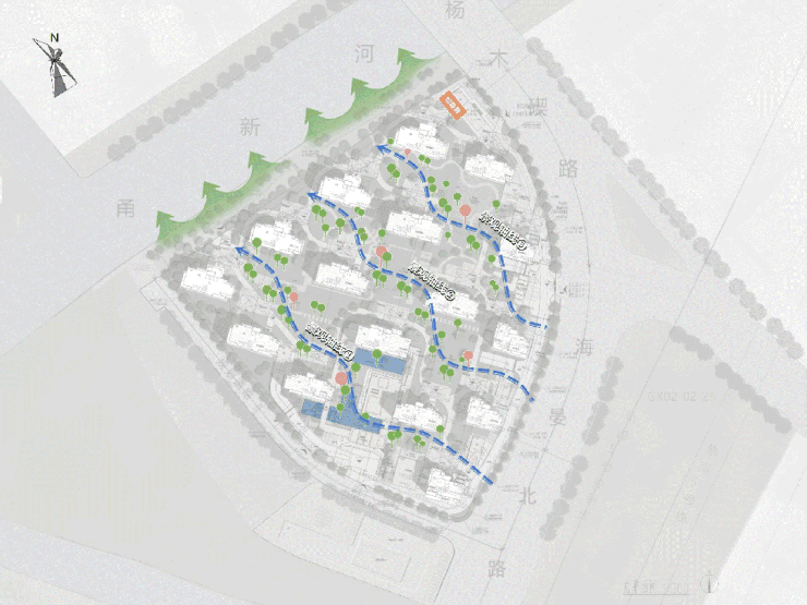 项目西临甬新河,坐拥一线水景资源。在常规布局中,此类资源往往专属于临河产品,造成“少数占有、多数旁观”的不利格局。而为突破这一限制,设计团队从空间句法入手,从平面到空间,多层次模拟分析,对建筑群落进行精细化错动布局,不仅实现水景资源最大化,并构筑南北风道以进一步提高产品舒适性,自然透气响应规划无界。