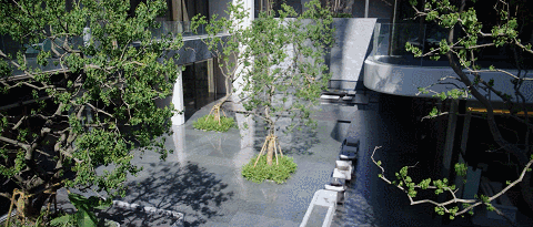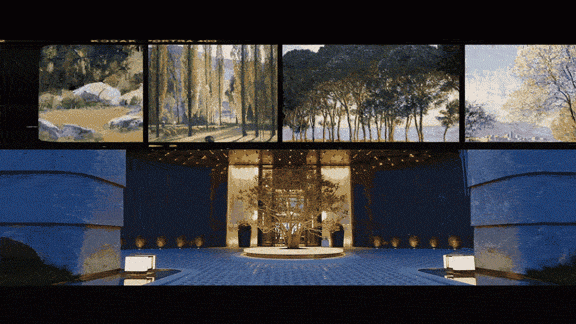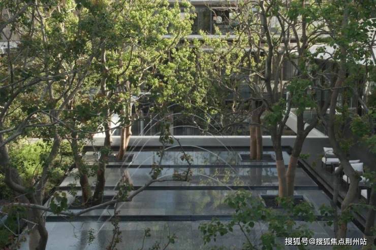 66米长横向水轴串联门厅、前厅、社区景观,12棵特选乌桕阵列生长于水面之上,以水轴构筑空间的无界与灵动。