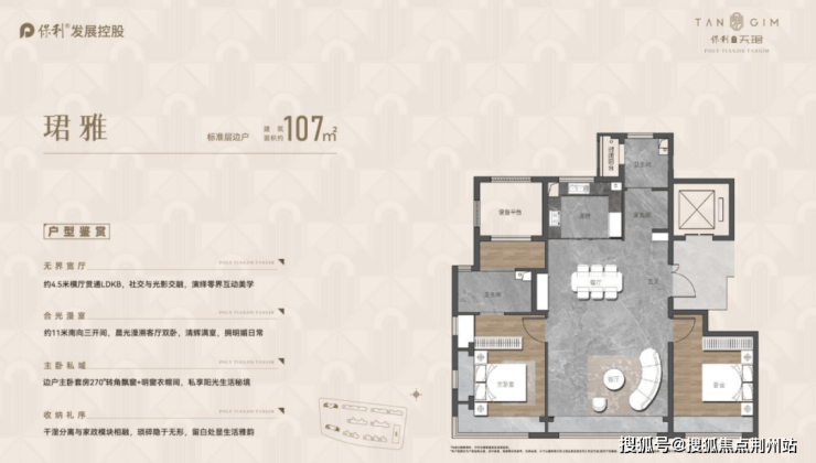 起步107㎡户型,把纯粹价格敏感的书包客户挡在了门外,也无形中拉高了项目改善的门槛,户型尺度又是可进可退的选择,正中学区兼顾改善客户的下怀。