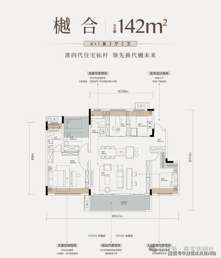 建面约143平4+1房两厅两卫:小高层户型,南北通透,四开间朝南,户型设计很赞,南向阳台很大,还做了横厅,可以做成五房。
