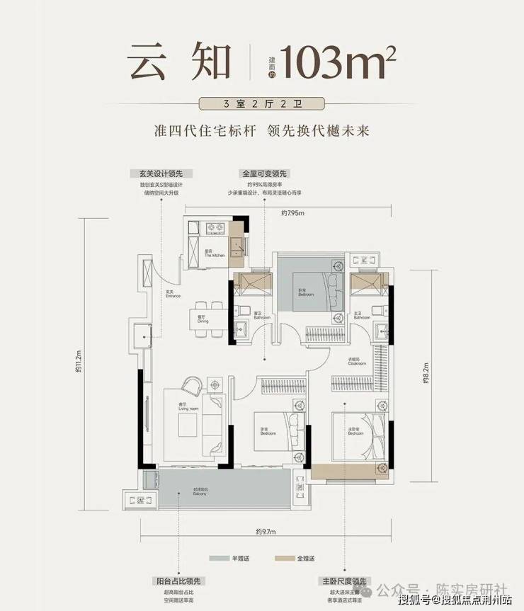 建面约103平三房两厅两卫:连廊中间户,三开间朝南,北边对连廊,优化空间较多,南向大阳台,主卧独立卫浴和衣帽间,是常规中间户的格局。