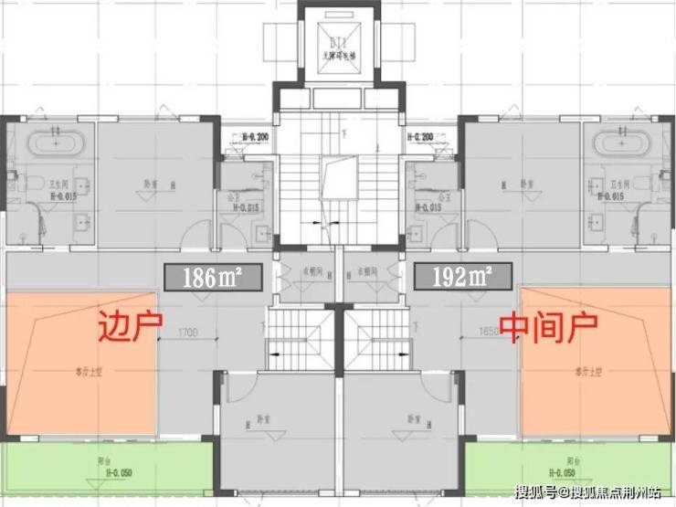 下叠:边户约186㎡;中间户约192㎡(四房两厅三卫):