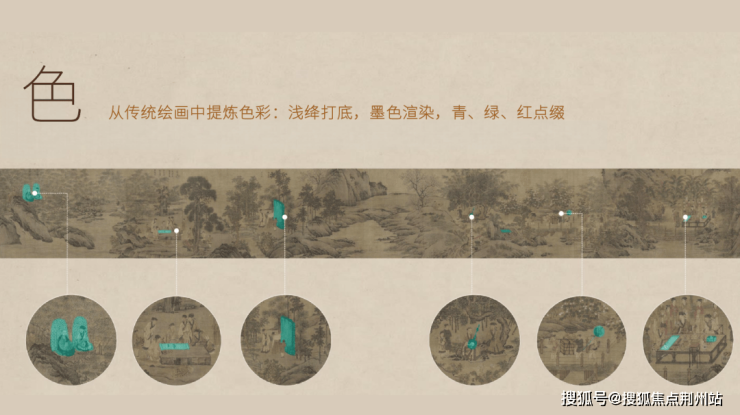 项目的整体美学系统从传统绘画与玉文化中提炼色彩与图案:以浅绛打底、墨色渲染,青、绿、红点缀,形成“玉之五色”的色彩系统;
