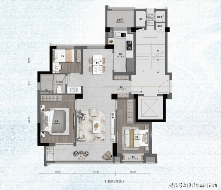 现在我们看到的是建面约99㎡户型,这是一个三室两厅一卫一厨的设计。