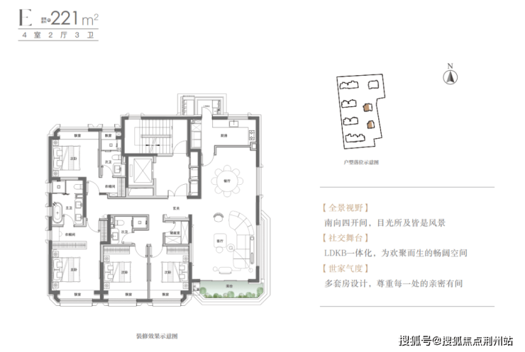 建面约221㎡4房户型真一梯一户的双玄关设计,打造独立尊崇的入户体验。