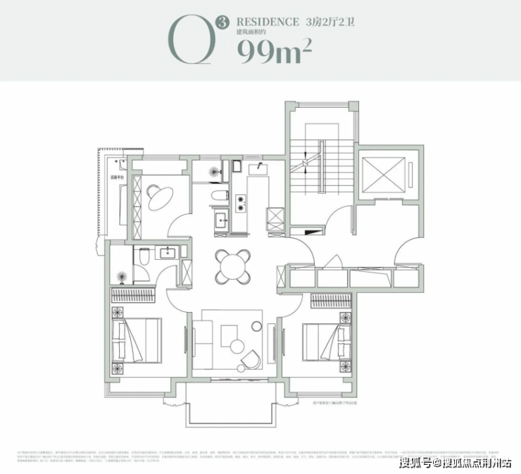 厨房、餐客厅、阳台形成直线通风廊道,南向三开间+宽尺客餐厅,轻松容纳二胎三代家庭的日常;