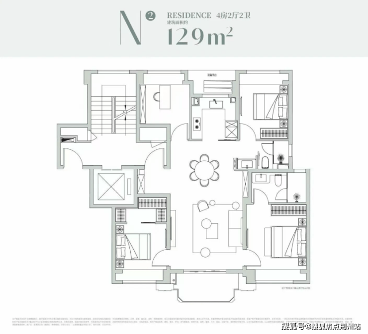 该户型是经典的四叶草布局,四开间分布在四角,兼顾私密与互动,是二胎家庭的优选;