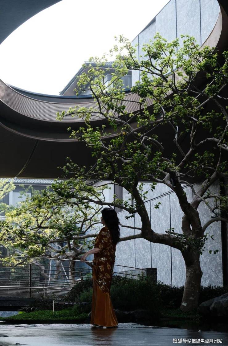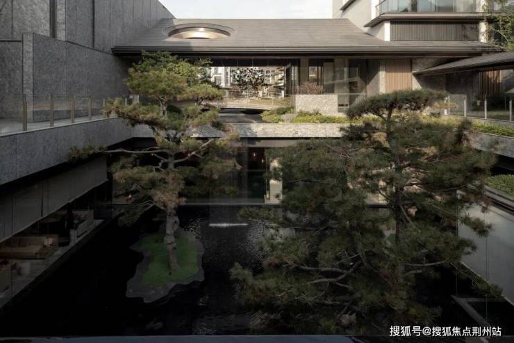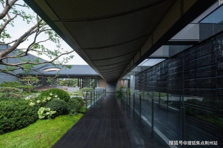走过约40米和风游廊、黛色青瓦下,踏星而行,复现古时大宅堂前,实现四季有景、步移景异,在自然行径之中,构建「四水归堂」的风雅之景
