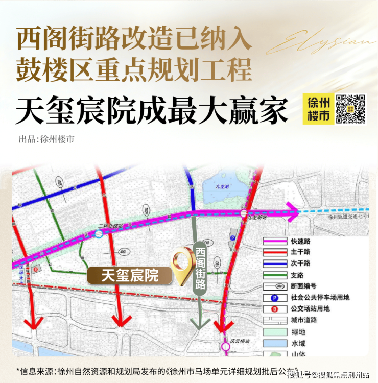 徐州市自然资源和规划局发布的《徐州市马场单元详细规划批后公布》显示,天玺宸院东侧紧邻的西阁街路,已被纳入鼓楼区重点项目。