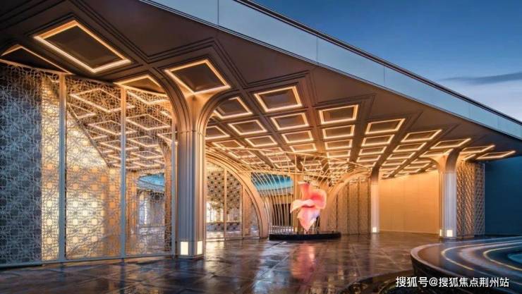 东侧为城市Image Mark界面,在这条150m长的烟火生活街上,打造了将近66m宽的极致庄重礼序的社区大门,寓意“金玉满堂”的门廊。
