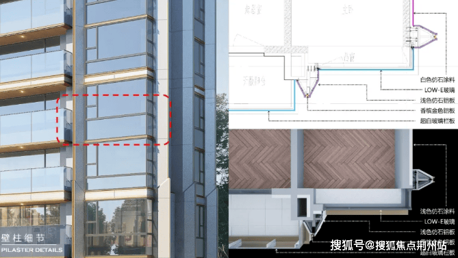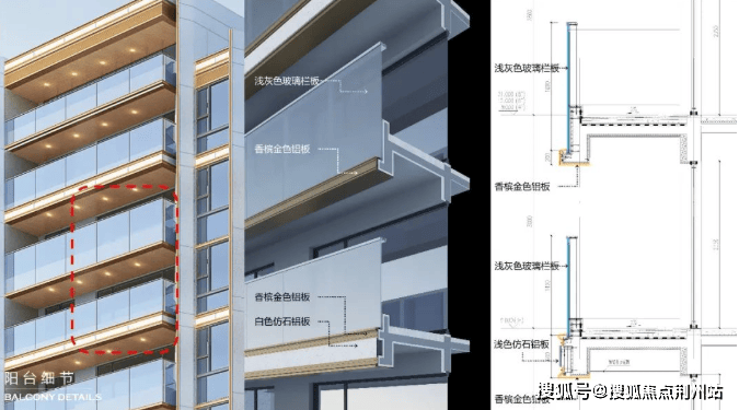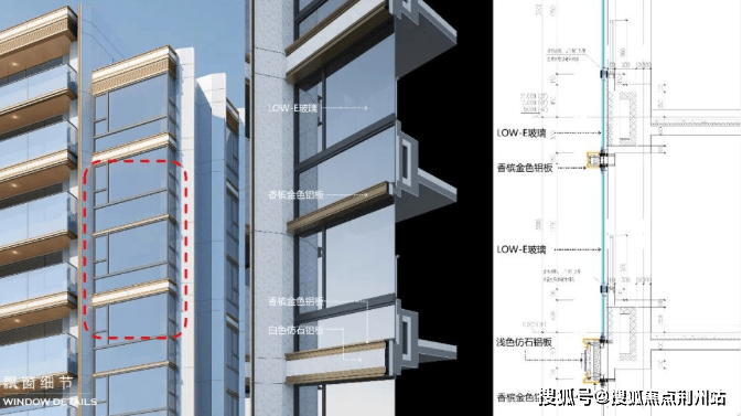 产品风格整体采取了更具有现代感的表现形式,注重表现虚实对比关系,材质的肌理关系,以公建化模式、色彩交织的线条强调立面形象与标志感,由银灰色、香槟金颜色构成,呈现时尚美学的风情与活力氛围。材质上通过大面积玻璃与铝板、石材的结合,精研每一个起承转合,让建筑呈现轻盈、现代的质感。