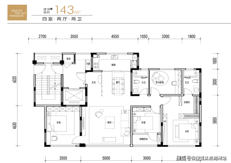 143㎡的套四双卫,四开间朝南,豪华主卧套房设计, 步入式衣帽间;独立厨餐厅,生活动线更舒适。