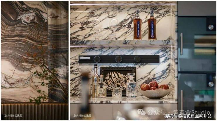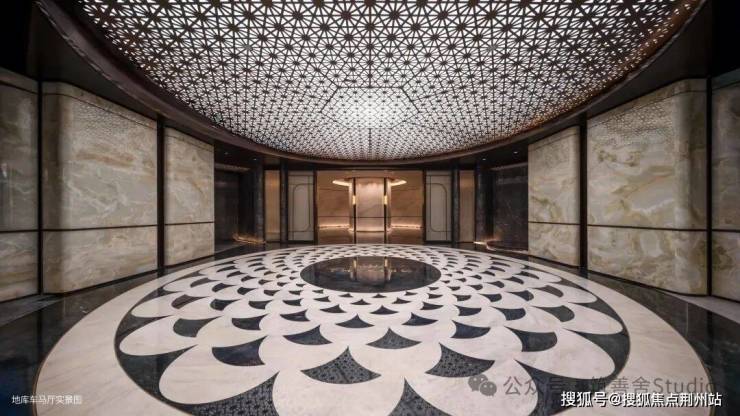 社区主入口横向展开面长达百米、高6米,参考酒店式入户设计,布置环岛落客区奢侈空间尺度。范思哲黑与安哥拉黑石材低调华贵,顶面千片鳞片造型似江浪灵动,百达翡翠原石与黄铜镶嵌而成“王冠之瞳”,整体空间奢华与优雅并存。