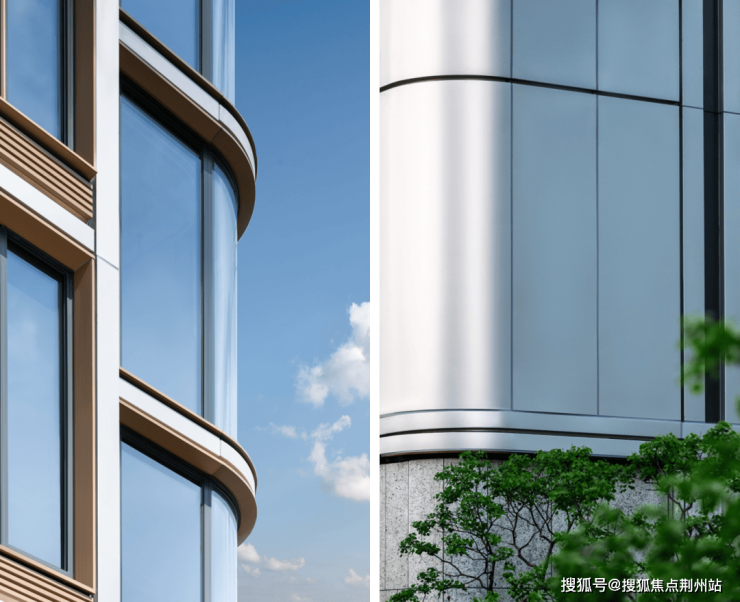 颜值上:曲面玻璃+铝板的高端配置,搭配温雅灰+典雅金的高级色调,灰色Low-E玻璃与天然石材镶嵌凤翎纹样铝板,一眼可辨。