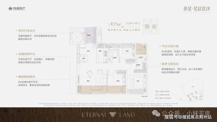 在伟星·星宸玖序,每款户型都拥有独立电梯厅,即便是最小的建面约105平中间户,也是一样。
