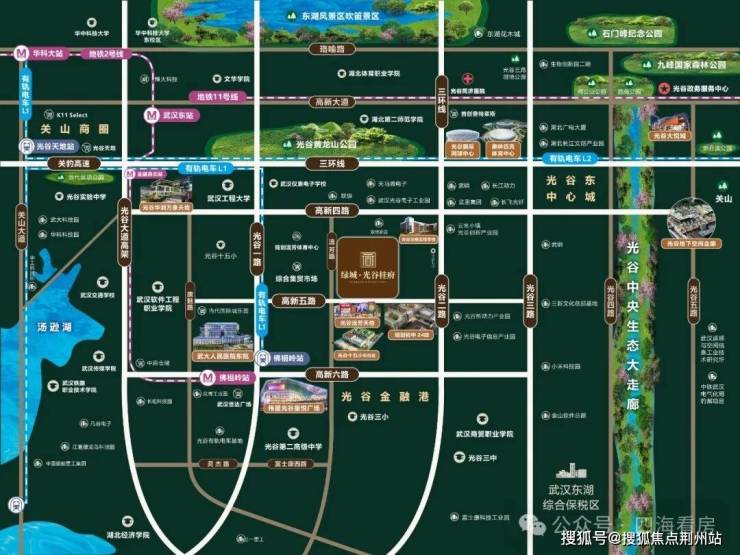 三横三纵,纵向串联光谷金融港、软件园和光谷老城区;横向连接武昌、汉口等核芯地区及光谷东。项目临地铁2号线佛祖岭站和L1有轨电车高新五路站,可通达全城,交通便利。