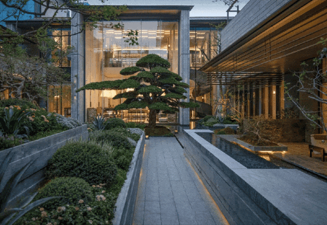 沿主轴铺展四季长卷,借松林、羽毛枫、乌桕、梅花等珍稀树种,呼应春华、夏茂、秋实、冬韵的时序意境。更溯源苏园之意,打造立体流动的山水庭院,模糊了自然与建筑的边界