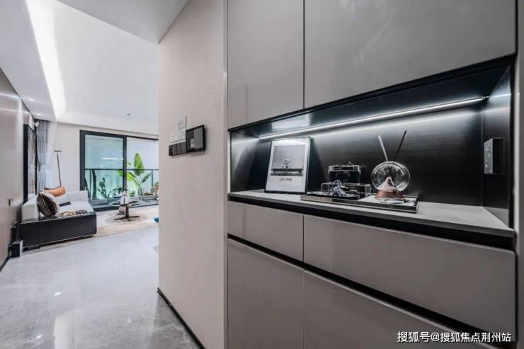 入户门设置玄关柜收纳体系,三段式设计,定制橱柜+石英石台面。