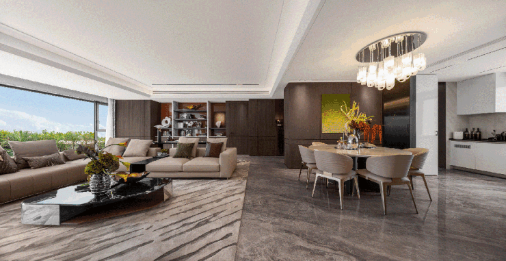 餐客厅一体化+超大横厅设计,无疑是整个大平层的核心亮点。一踏入这个空间,便能感受到它带来的强烈视觉冲击感。