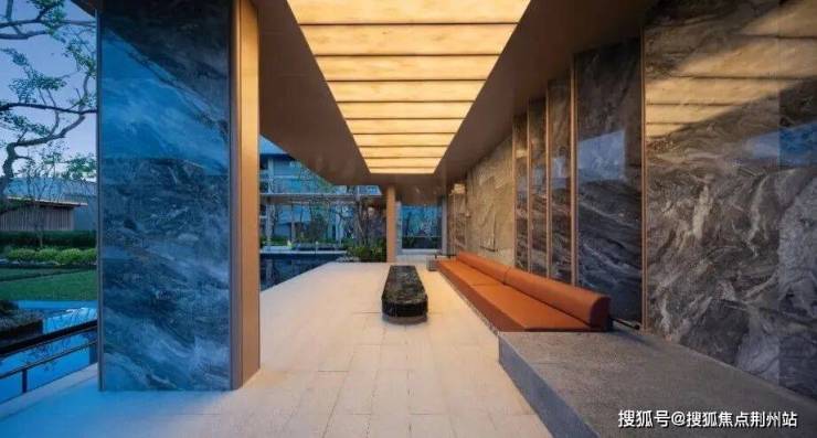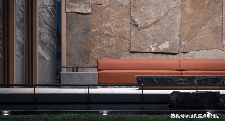 中央苏格兰银灰 廊架搭起业主 活动 灰 空间, 中国黑老皮石 景墙衬出仪式感,千 年雨痕凝于石上,光影洇开,是古今对话,藏江南气韵。