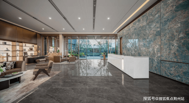 1&2层更臻选“蓝宝石”石材, 远观时,石材的质感与玻璃的通透相得益彰;近赏时,天然纹理里藏着时光的细腻,每一处都藏着绿城对“美”的执着。