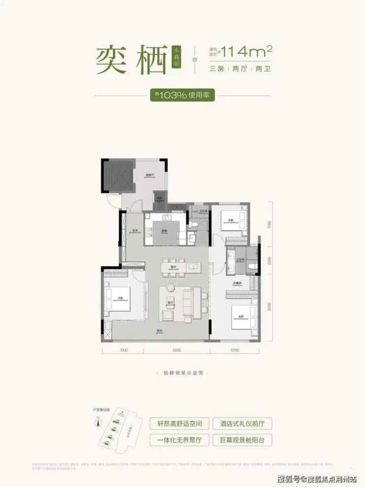 根据目前公布的户型图,该户型南向开间超16米,拥有双套房设计,优化后最高约112%的综合使用率,改善客群可以保持关注。
