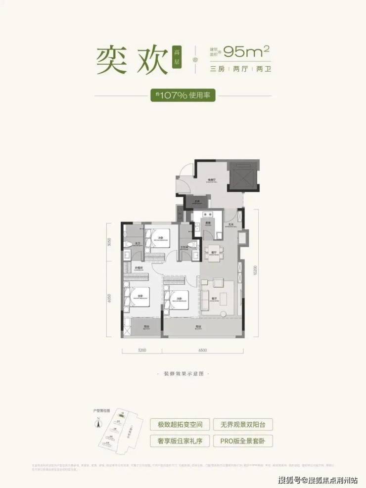 建面约95平三房两卫,优化后综合使用率约107%,在区域内入手门槛更低,比较有竞争优势。