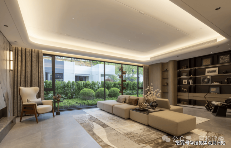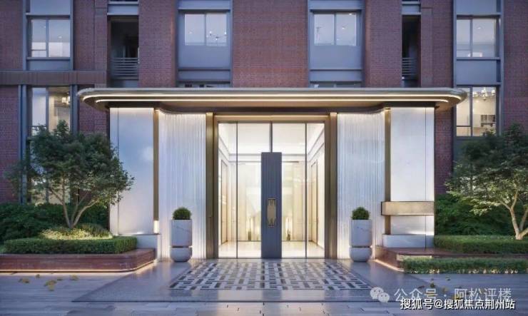 采用弧形外延式门廊、金属线条与大面积玻璃相结合打造的洋房单元入户门,以及颇为讲究的地面铺装,从整体规划到细节拿捏都非常到位。