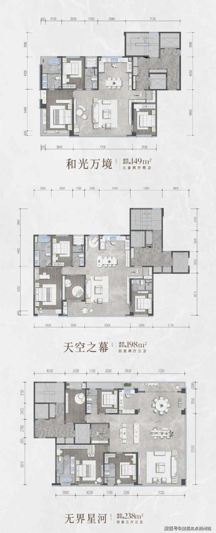 最值得关注的是户型,山河颂共3个户型,分别为149-238平米,涵盖大多数改善群体的需求。